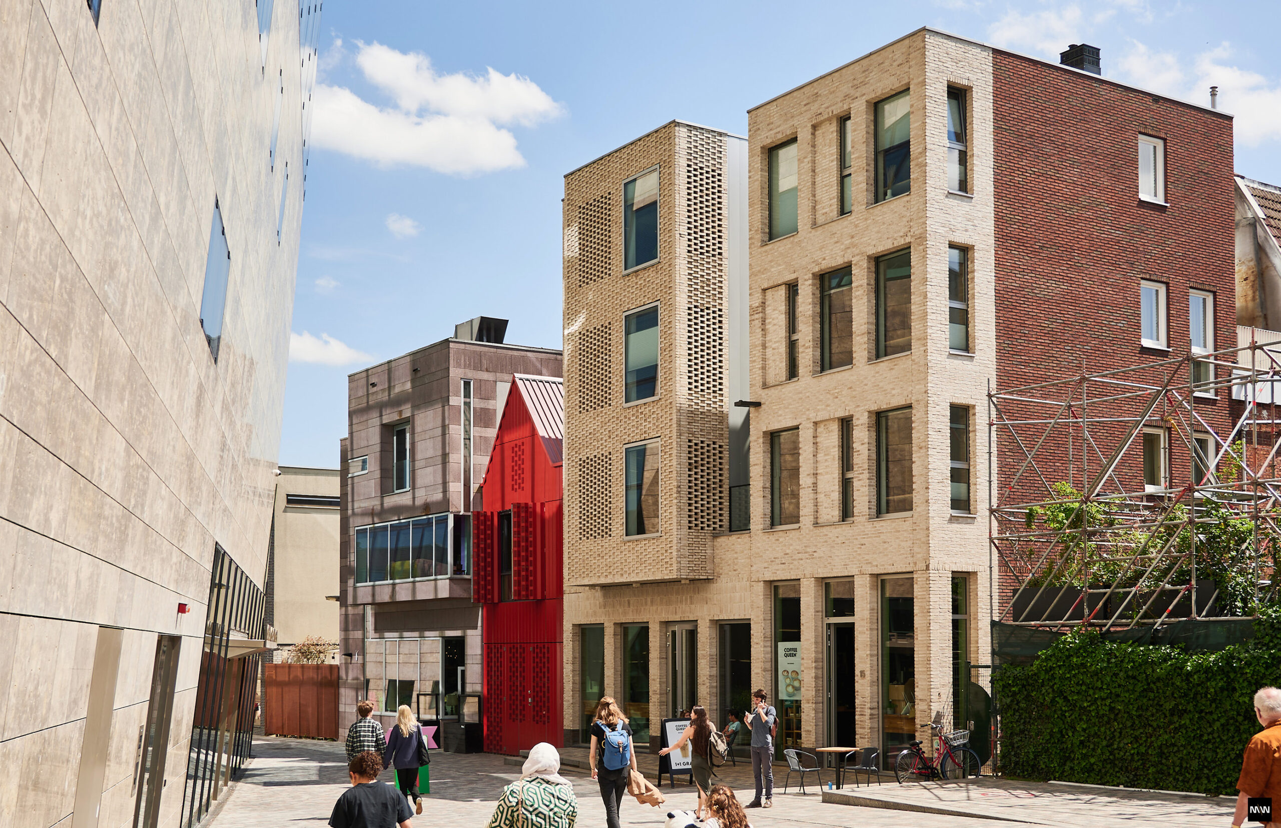 Het monumentaal vastgoed werd getransformeerd en gecombineerd met nieuwbouw, tot een programma van commercieel vastgoed en wonen. Vanwege de publieke toegankelijkheid zijn de functies op de begane grond ontworpen met veel glas en transparantie naar het openbaar gebied. In het Rode Huisje is een kapsalon gevestigd die zo is ontworpen dat het de Nieuwe Markt verbindt met de Poelestraat. Met Spot On voegden we prachtige studio’s en appartementen toe aan de Nieuwe Markt, samen met een commerciële plint waar inmiddels een makelaarskantoor is gevestigd.